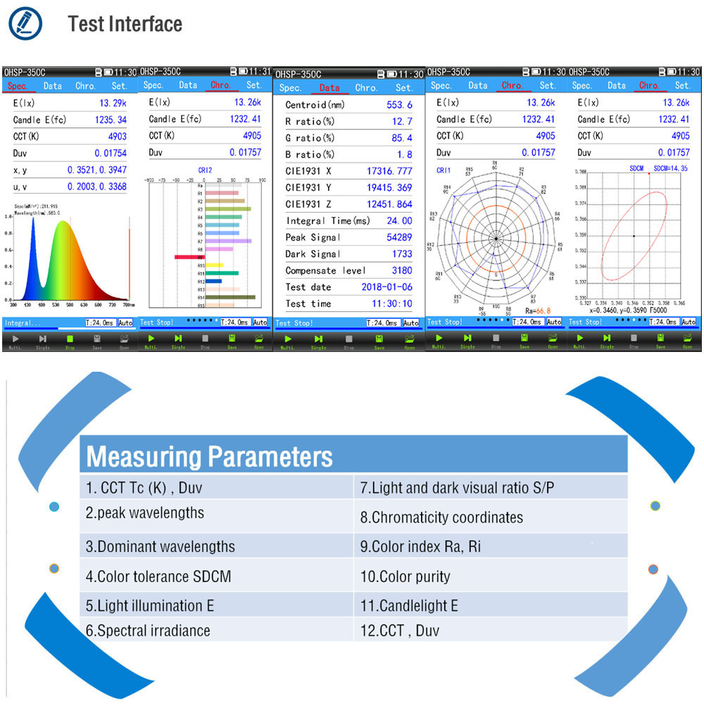 inch touch screen, Real-time display of measurement parameters and curves ,use convenient and fast.not only measure LED wide spectrum light source ,but also measure CFL,HID narrow spectrum light source.