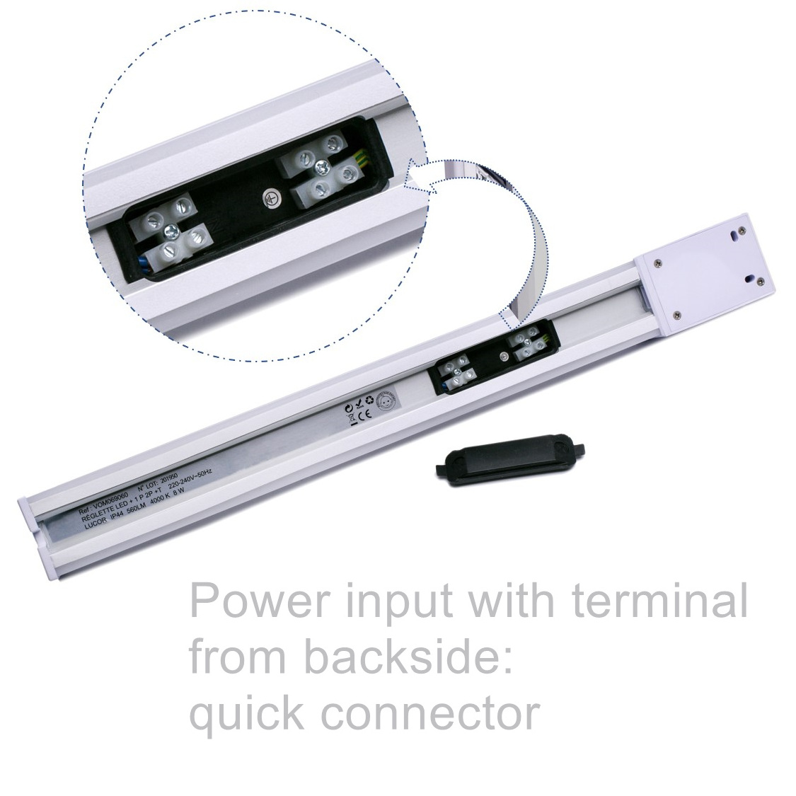 Power input with terminal from backside: Screw-up connector and quick connector