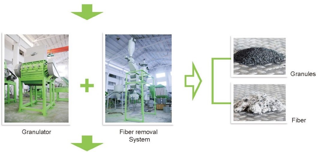 The Granulators are designed to grind the rubber mulch from the Grater into small granules as fine as 1 mm. The granules are screened and re-circulated until the desired size is reached. Due to the design of the Granulator and precise alignment of the blades, the Granulator produces a very uniform cut and high quality granule. During the granulation process, 99% of the fiber is removed, leaving a contaminant free crumb rubber granulate ready to be further processed or sold.