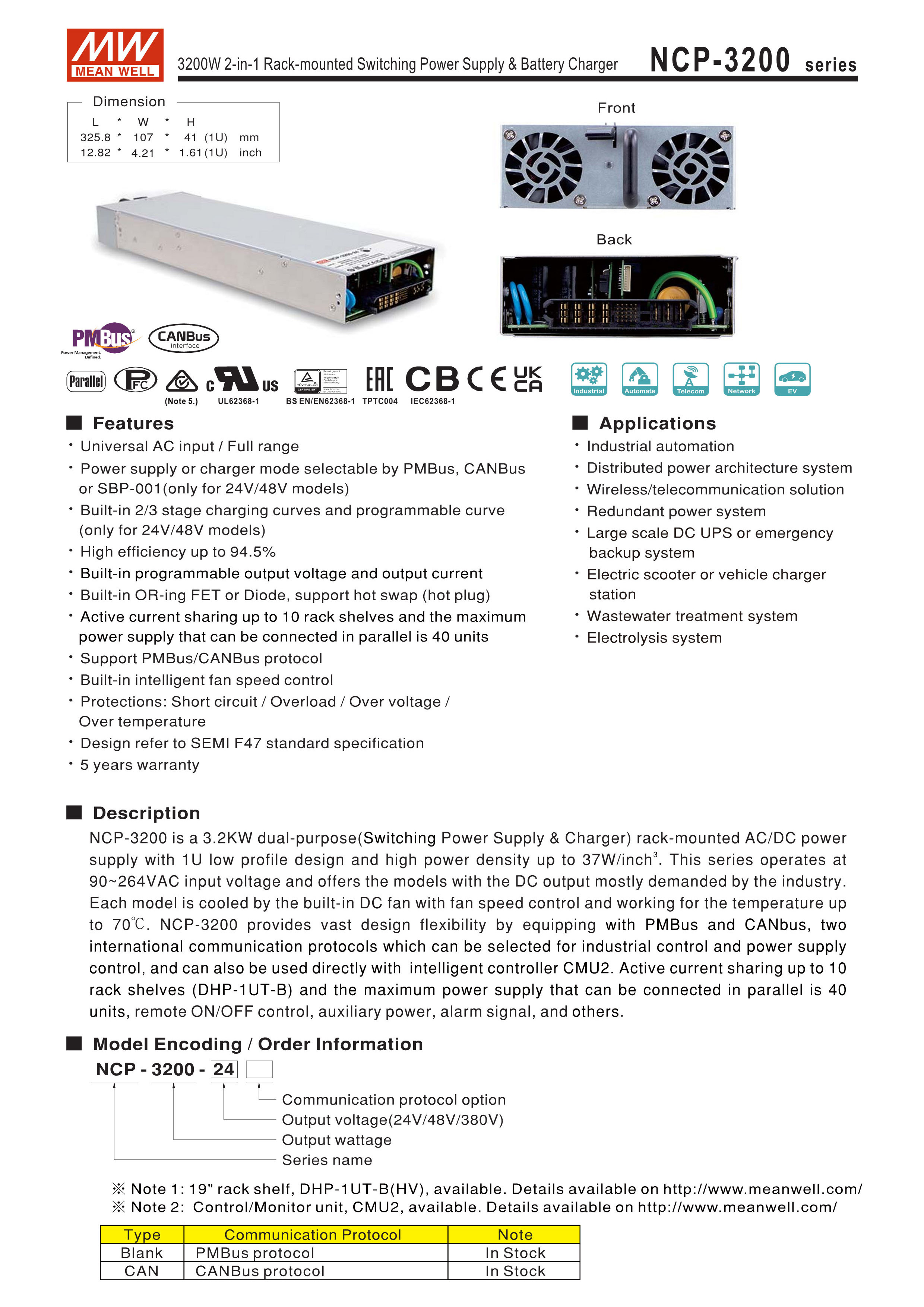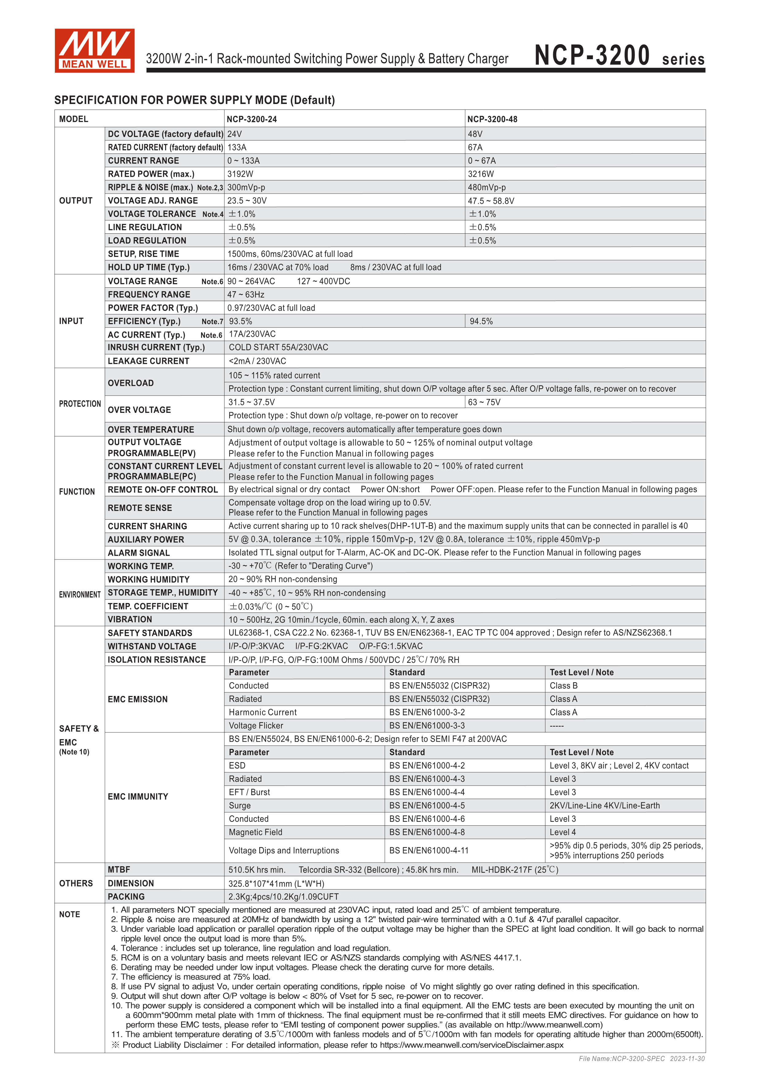 Meanwell ncp-3200-48 67A 3200W 2-in-1 Rack-mounted Switching Power Supply & Battery Charger NCP-3200 48V 24V 380V Mean well
