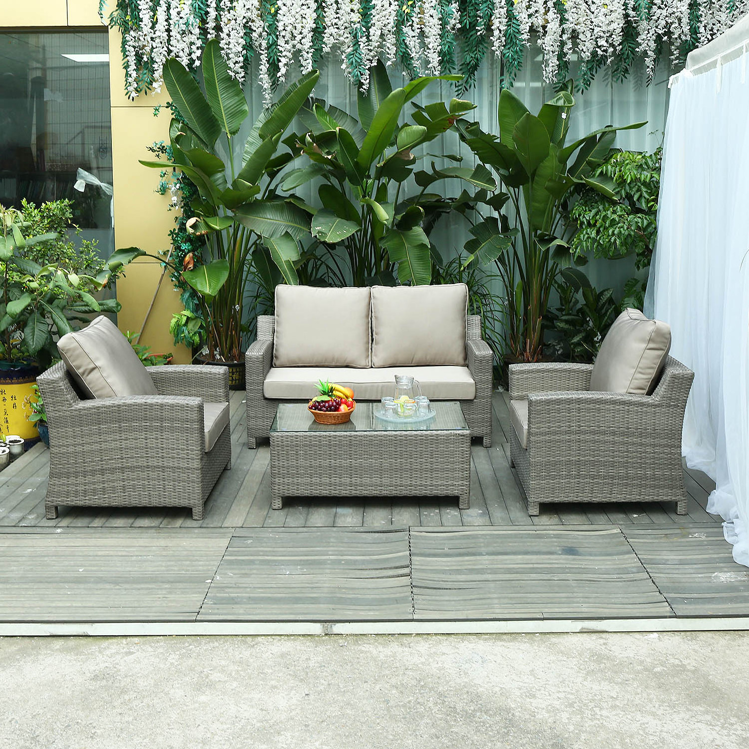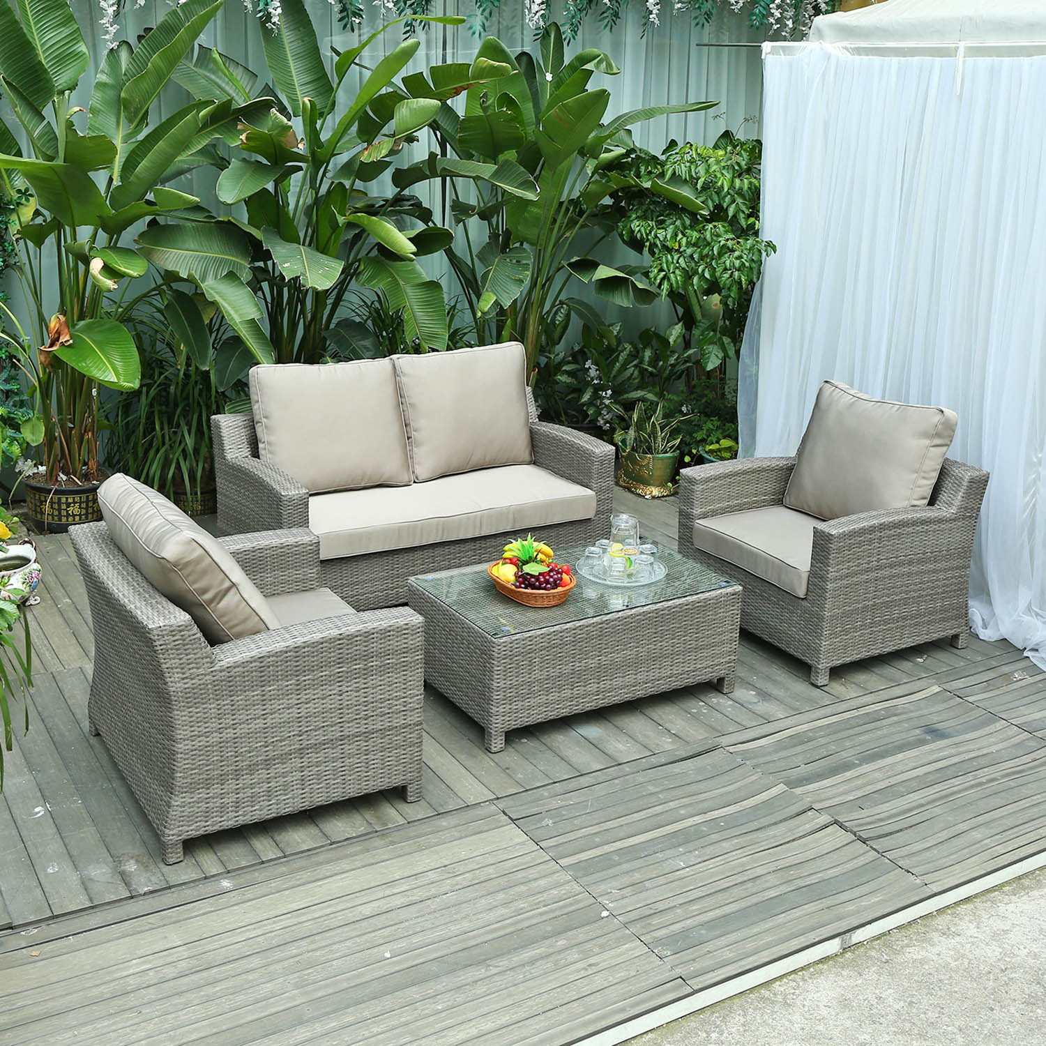 Products Details&Size: Aluminum frame+PE woven rattan single sofa with 10cm thinckness cushion:90*80*72cm Aluminum frame+PE woven rattan two seater sofa with 10cm thinckness cushion:150*80*72cm Aluminum frame+PE woven rattan table with 8mm thickness tempered
