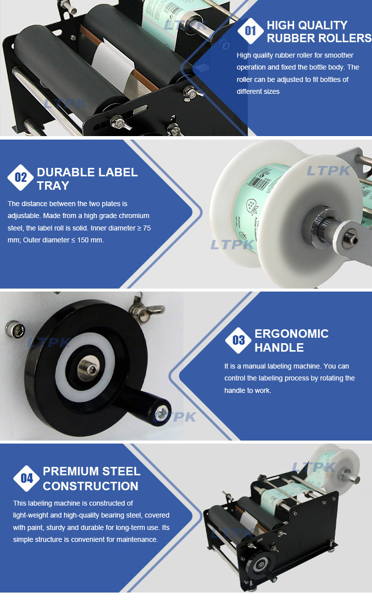 It can help you remove a label from its liner or backing paper easily.This labeling machine is designed to label round bottles. Comparing to the large-size machine, our labeling machine takes little space and can be easily moved from place to place.
