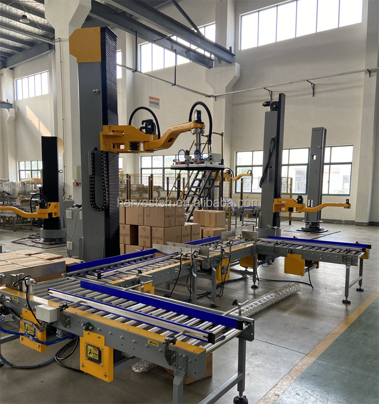 The appearance is exquisite and beautiful, the adjustment is convenient and simple, and it can be applied to a variety of products and palletizing types. It can be used independently or it can be equipped with an automatic stacker and pallet conveyor to realize a fully automatic palletizing system.