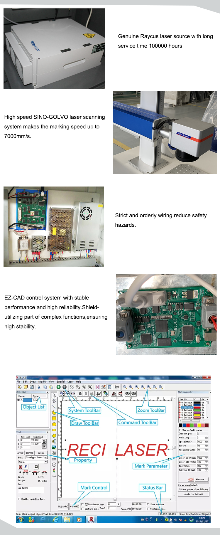 The fiber laser,vibration mirror,Galvo head,laser control card are the main parts of the machine.Reci series fiber laser marking machine adopts high quality parts: