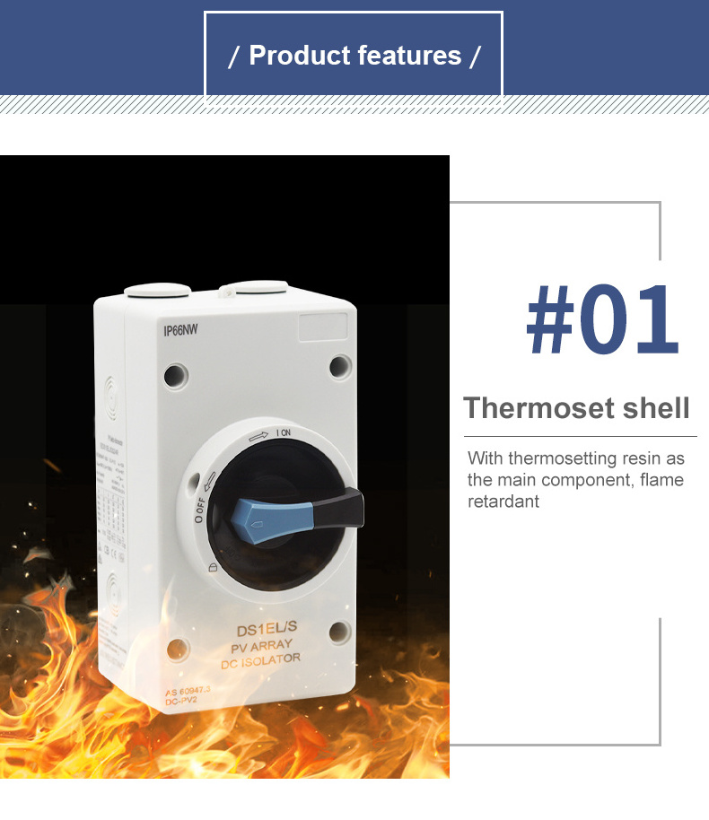 DS1EL-S32 IP66 enclosed 1000V 32A DC isolator switch is developed for solar installation. Put on the roof top and between the solar arrays and solar inverter. For isolation the PV array during system installation or any maintenance.