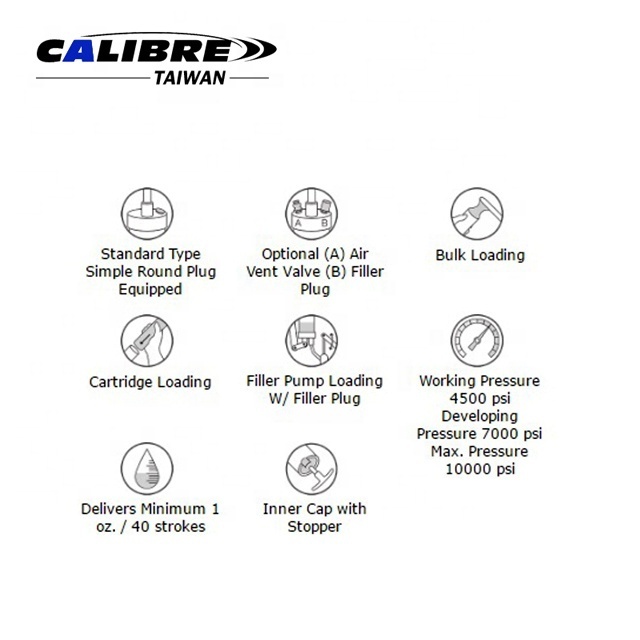 * Optional (A) Air Vent Valve (B) Filler Plug. * Bulk Loading. * Cartridge Loading. * Filler Pump Loading W/ Filler Plug. * Working Pressure 4500 psi Developing Pressure 7000 psi Max. Pressure 10000 psi. * Delivers Minimum 1 oz. / 40 strokes. * Inner Cap W/O Stopper. |