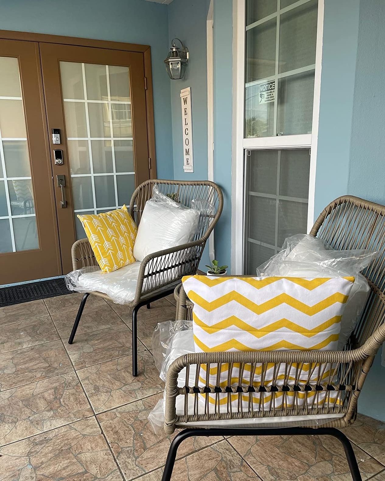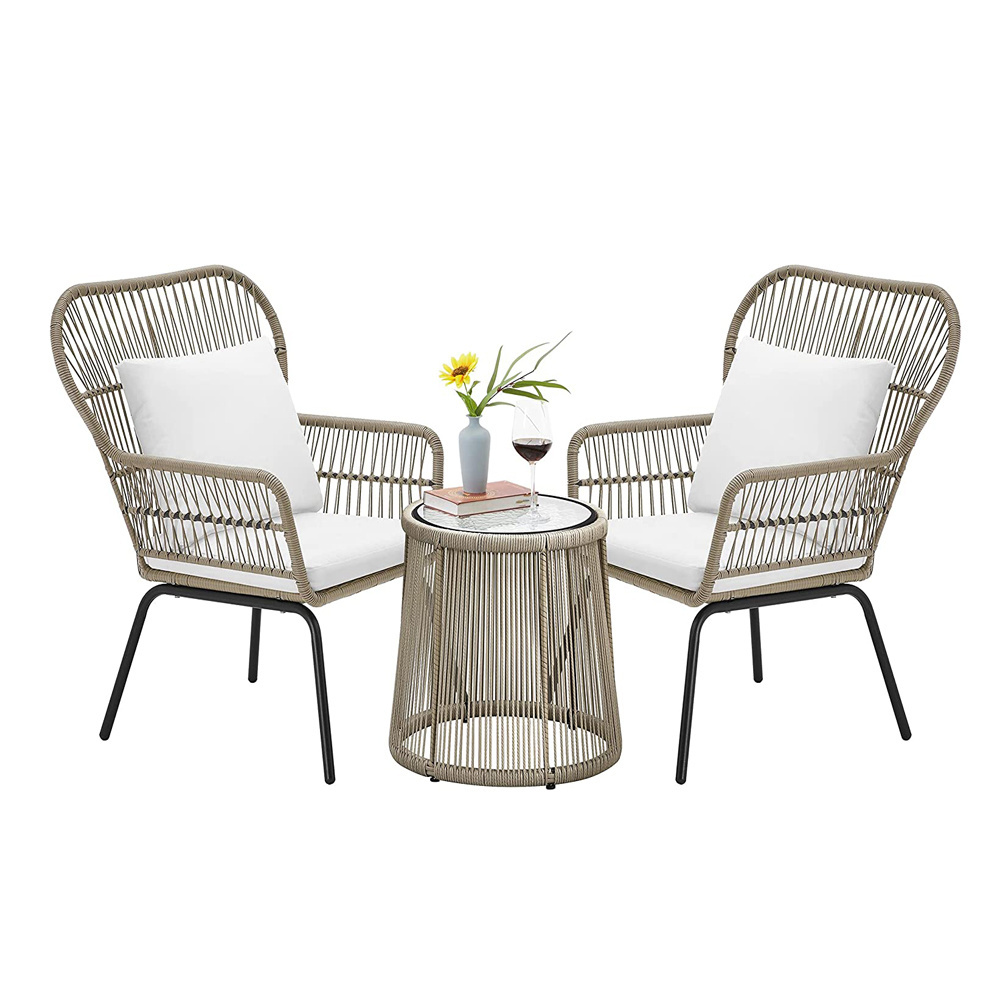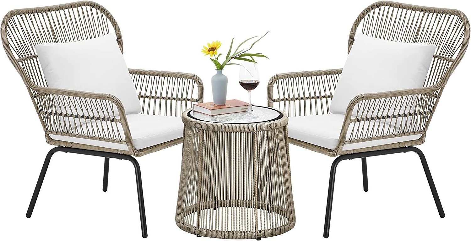 This wicker bistro set features two crafted hand-woven rattan chairs, which are not only sturdy enough but also provide a versatile appearance. PE rattan gives a chic appearance while enhancing the texture comfort of natural rattan with its high durability and all-weather resistance.