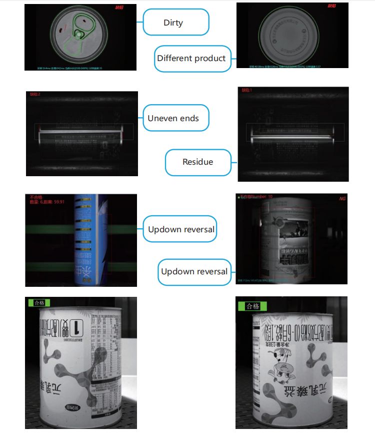 Detectable defectsWeld residue、tail、Uneven ends、Blackening of welding wire、Internal and external reversal、Printing reversed、Connecting cans