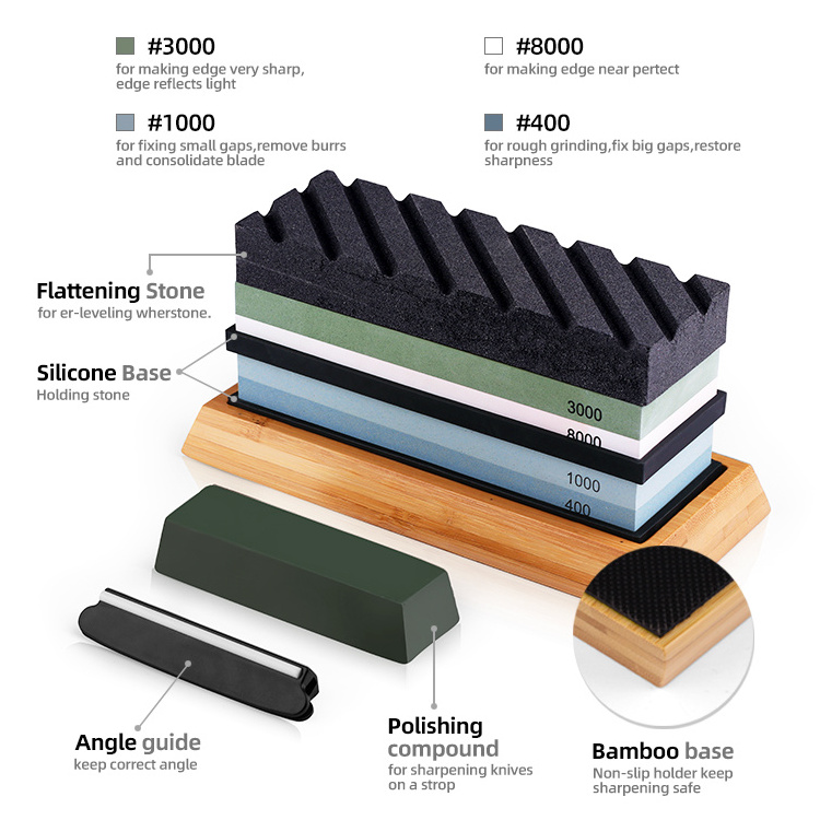 1 pc whetstone, 1 pc angle guide, 1 pc bamboo base, and 1 pc Silicone Insert