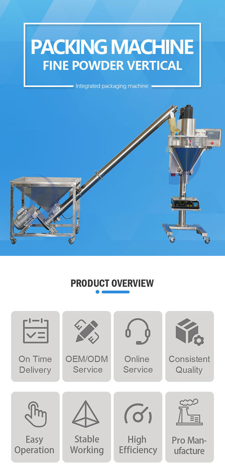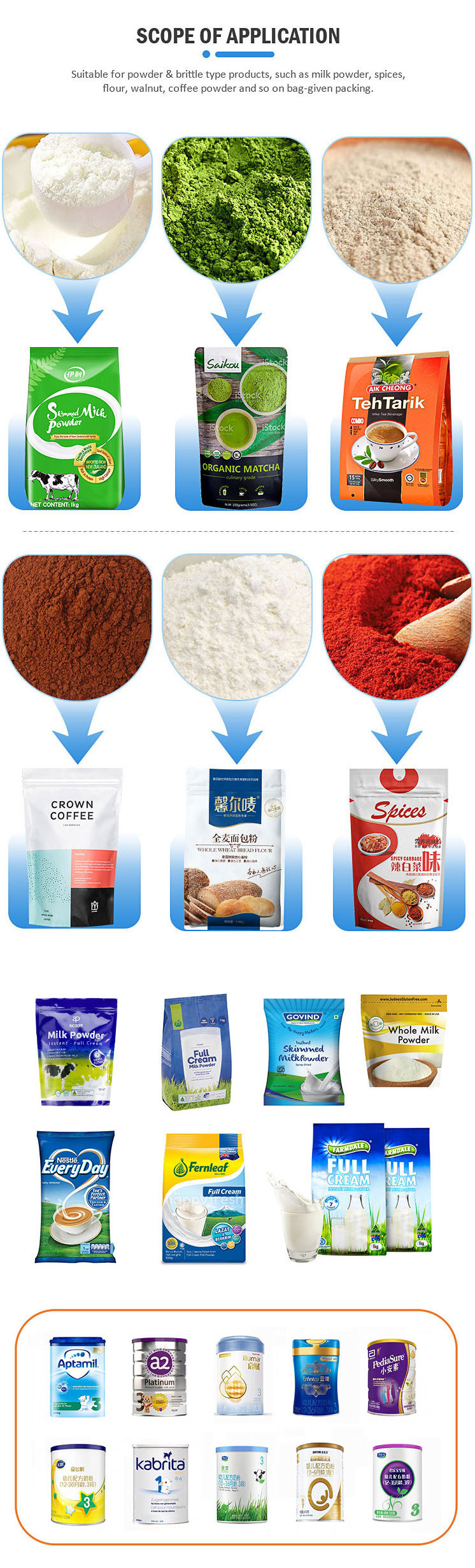 especially for packing the fine powder material. Such as coffee powder, milk powder, flour powder, spice powder, detergent powder, chili powder, masala powder, cocoa powder, baking powder, bleaching powder, chicken powder. It integrates metering, bagging, packing, sealing, date printing and counting into one.