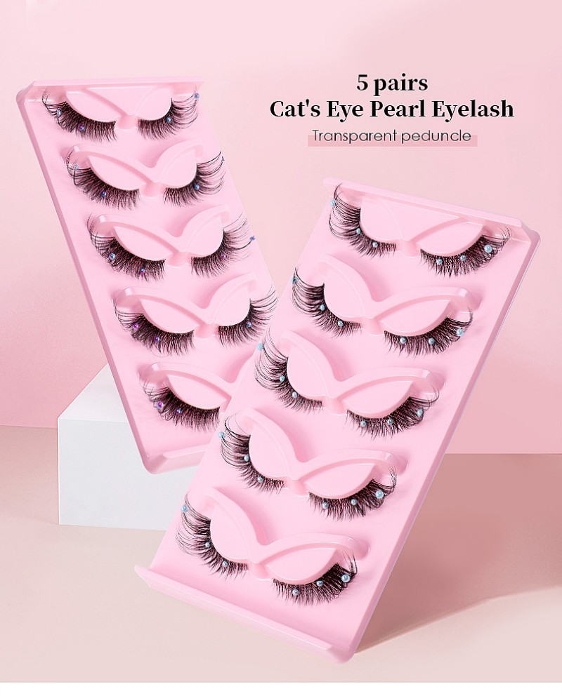 Wholesale handmade 5 pairs faux mink invisible band cat eye strip lashes fox eye fake lashes with pearl decorate