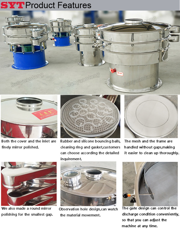 SY-Vibrating Sifter is a kind of mature technology,general and tend to be standardized classic inertia screening equipment.It can meet the requirement of most materials in grading granulated stuffs and screening out powder and liquid in different operation.High screening efficiency,it adopts whole sealing structure design which can avoid polluting effectively.The direction of outlet port can be changed within 360 degrees.We can provide customized service according to customers' requirements.When the machine begins running,the operation of the vibrating motor generates exciting force,then under the power of exciting force,the machine body do compound movement,last,the materials on the sieve mesh do jumping movement with the machine body.