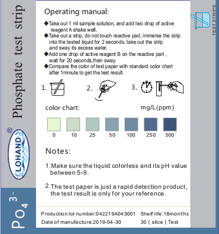 | Phosphorus test strips | LH1012 | 0-10-25-50-100-250--500mg/l | 18 month | 100/box | Test paper colorimetry |
