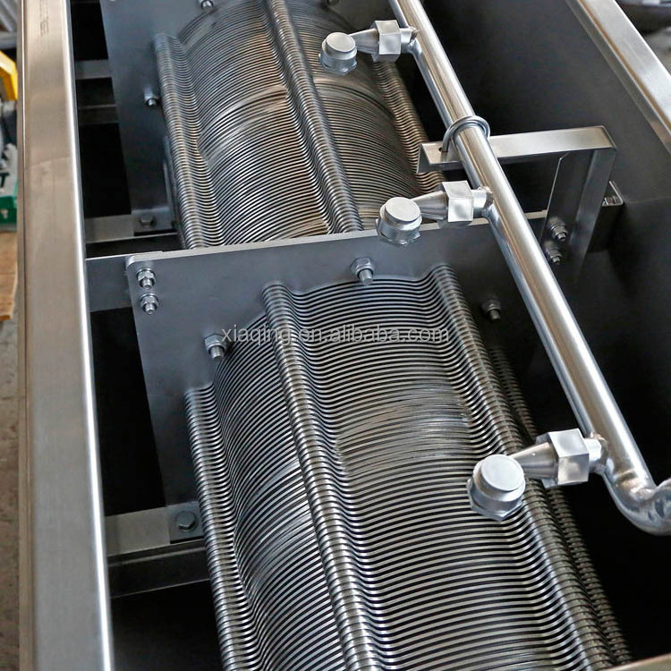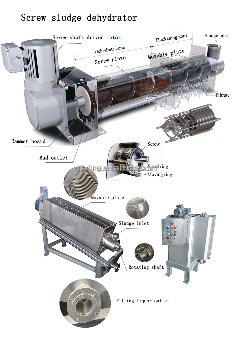 screw type sludge dewatering machine belongs to screw press dewaterer, can reduce the sedimentation tank and sludge concentration tank, saving the cost of sewage plant construction. Fold screw type sludge dewatering machine is provided with multiple ring plate automatic cleaning filter technology replaces the traditional filter sieve, self cleaning filter technology to ensure continuous stability of mud dehydrator separation effect, through the screw diameter and pitch changes produce strong extrusion, and the tiny cracks between swimming ring with fixed ring, implementation to squeeze dewatering of sludge, is a new type of solid-liquid separation.