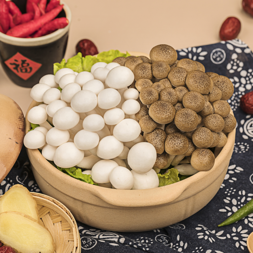 shimeji mushrooms, white and brown.The taste is crisp and tender, andthe taste is delicious. Rich in crudefiber, containing a variety of aminoacids. lt has good antio xidant andimmunomodulatory effec, and is alow-calorie, low-fat health food,which can be eaten by the generalpopulation