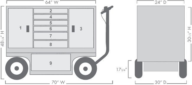 - Overall dimensions 70" x 30" x 48", Tool Box dimensions: 64" x 24" x 43 1/2"