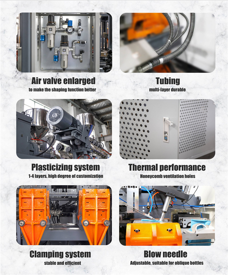 This is our normal series machine.It is double station.This machine is suitable for the jerry can.It can be equipped with several die-heads and then it is also suitable for small bottles.
