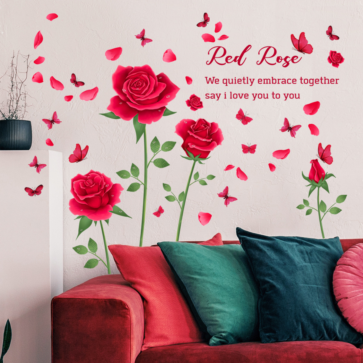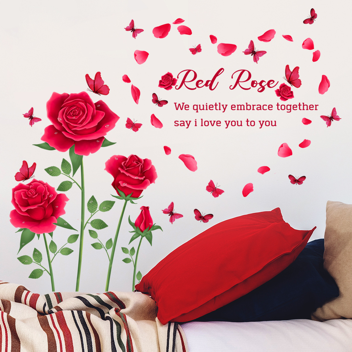 Wholesale Custom New Valentine's Day PVC Removable Butterflies Flower Rose Decorative Hotel Wall Sticker for Bedroom