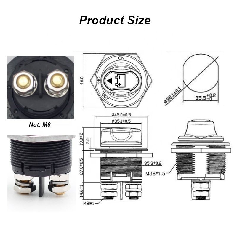 【Battery Disconnect Shut Off Switch】They are offered as main car kill disconnect switches, rated 75 Amps intermittent, 100 Amps continuous at max.50V DC; Cranking Rating: 300Amps 5 sec; Contact Resistance: 50m ohm Max.;Isulation Resistance: DC 500V 100M ohm Min.