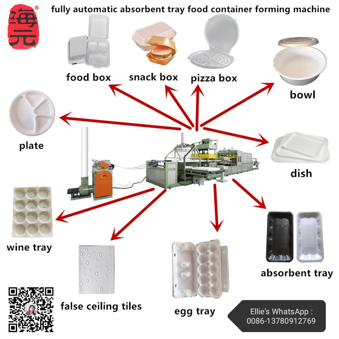 this machine can produce normal PS foam disposable food box / plate / bowl / dish / egg tray / wine tray / false ceiling tiles / food container ; also can produce PS foam absorbent meat tray , the absorbent tray with holes can absorb fresh meat or chicken blood very fast .
