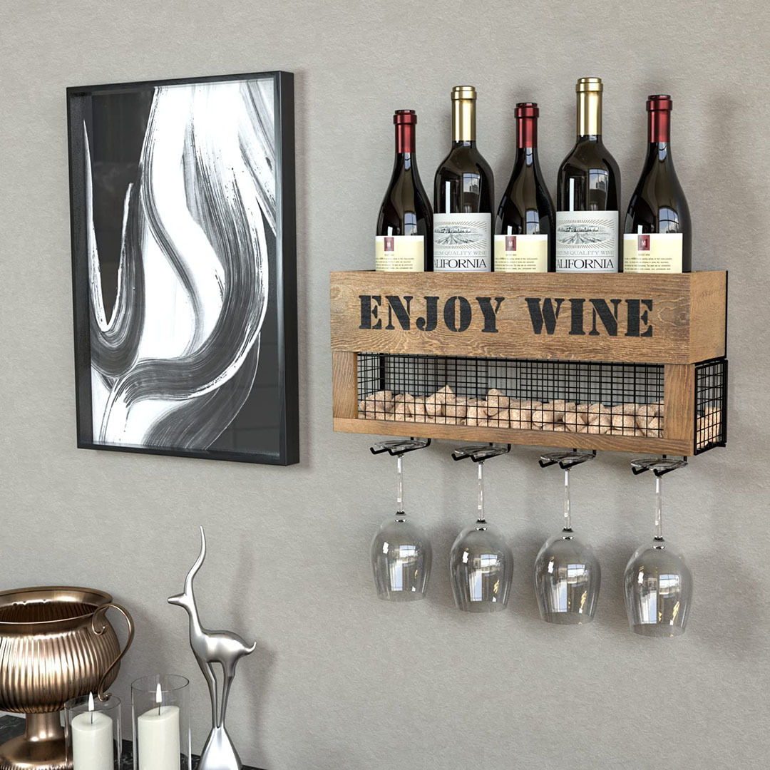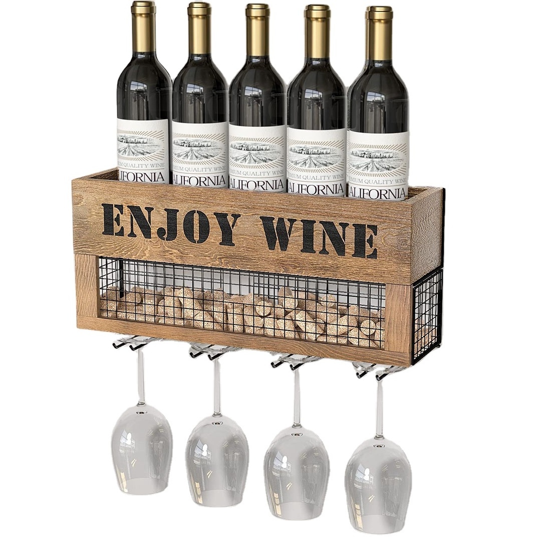 Stylish Home Decor Rustic Wood and Metal Wine Rack made of solid Paulownia wood Bottles and Glass Holder Cork Storage