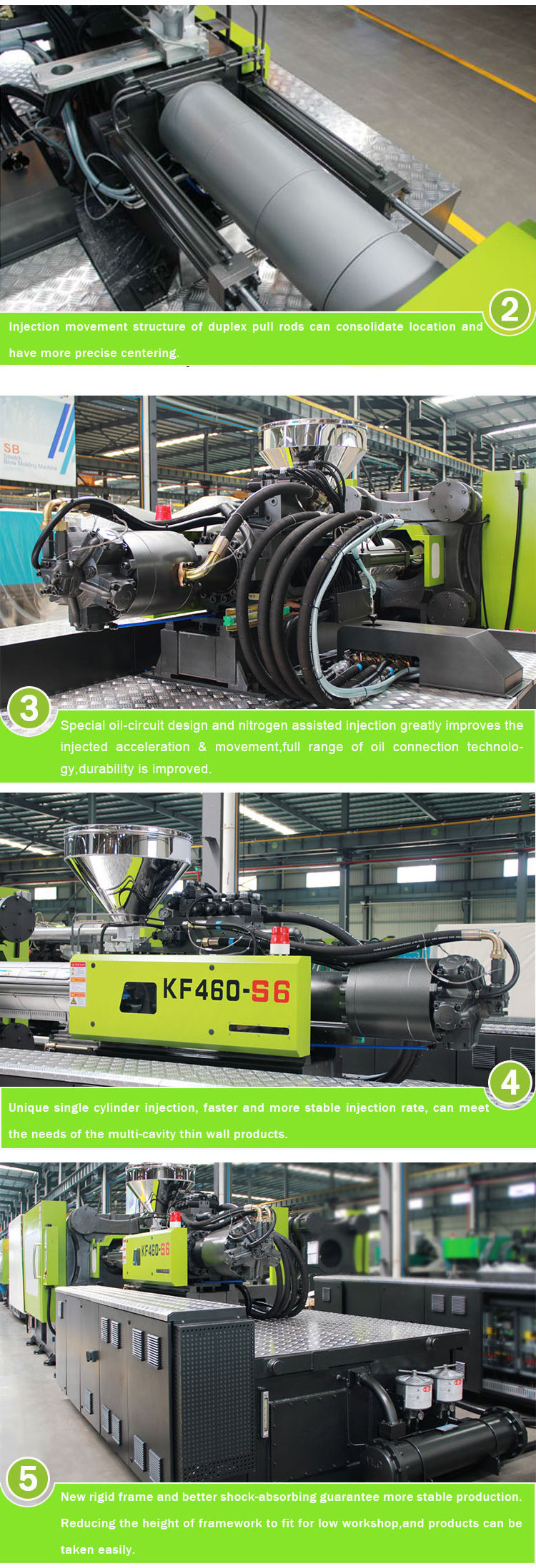 Brand new 3-platen clamping design,which will optimize the stress distribution and has higher rigidity and more stable performance, meeting the demand of rapid me chanical movement.