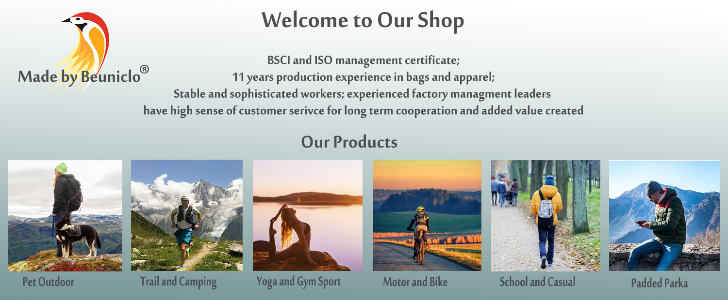 We have 2 categories. One are men coat, jacket and gym sport wearing; the other are all kinds of soft bag, like motorcycle and cycling backpack, casual backpack and functional bags.