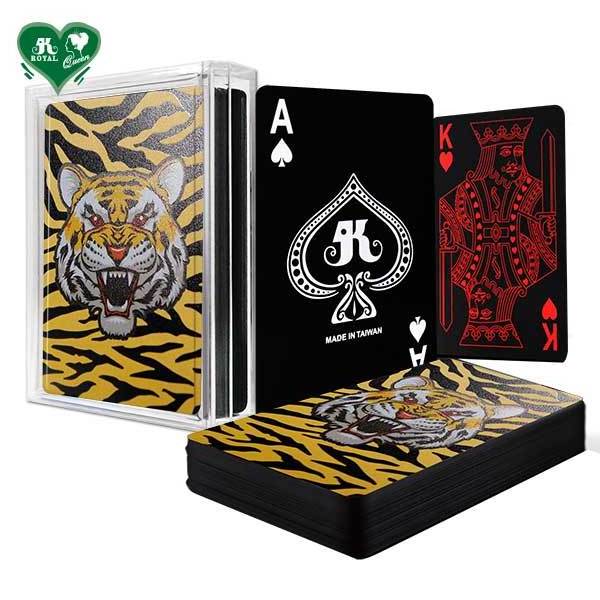 The tiger pattern on the back of the Cool Black Tiger Playing card deck is not only eye-catching, but is also a demonstration of Kuo Kau’s professions on special printing technique. On the full color printed card back, the black areas of tiger pattern are varnished with special gloss. When being illuminated, the black stripes will be slightly glittering, quietly but elegantly displaying the grandeur power of the tiger. In addition, the reverse black and white design, with black background and white numbers, gives its user a fresh new impression.