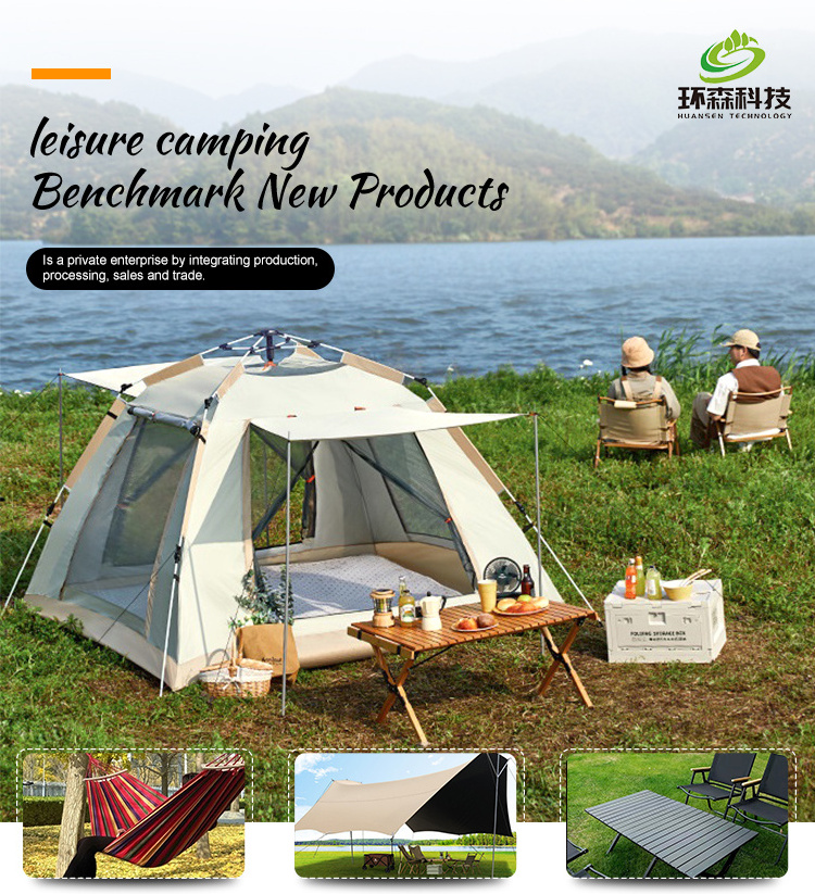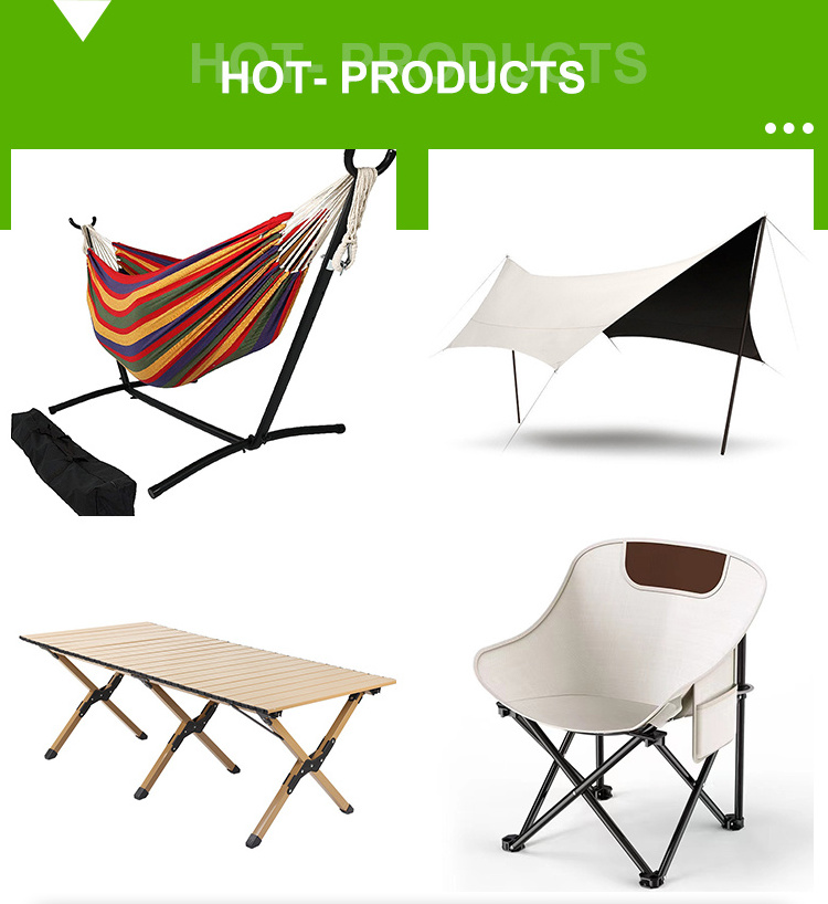 Outdoor supplies such as tents, rooftops, folding tables, folding chairs, hammocks, and solar powered water pumps.