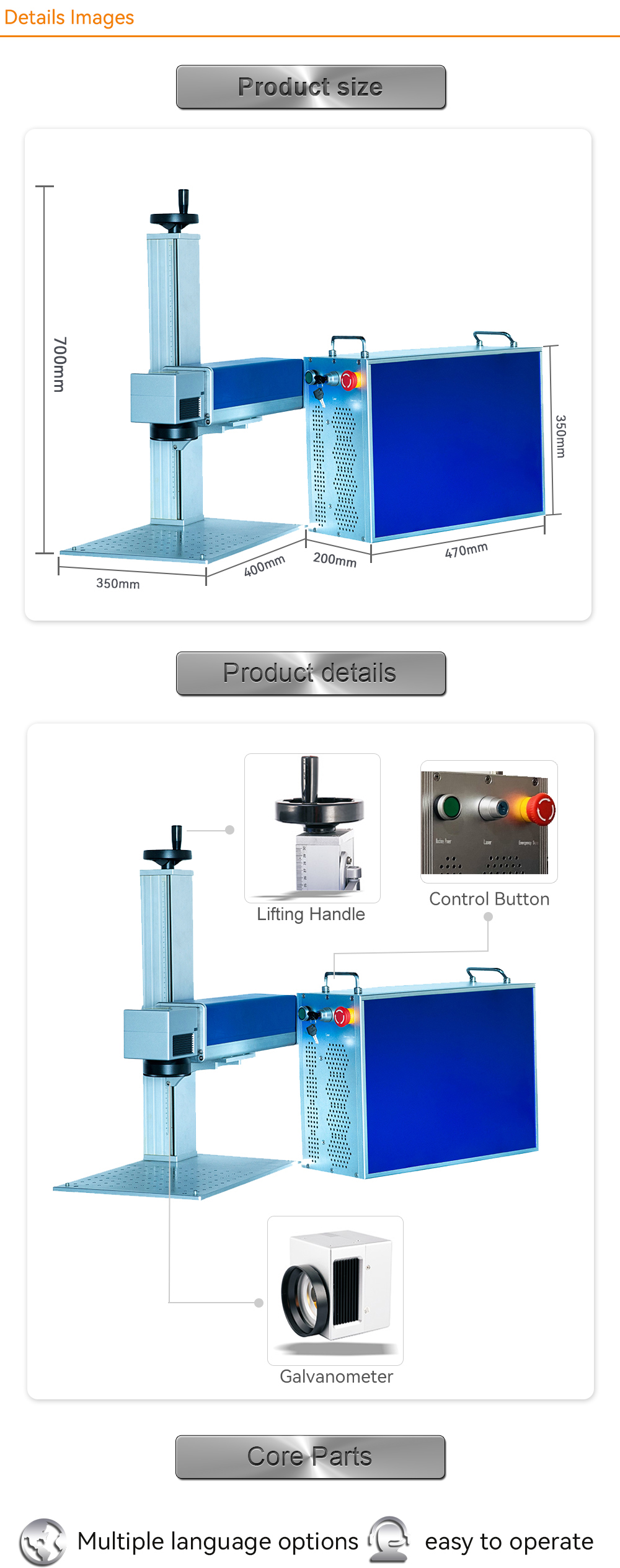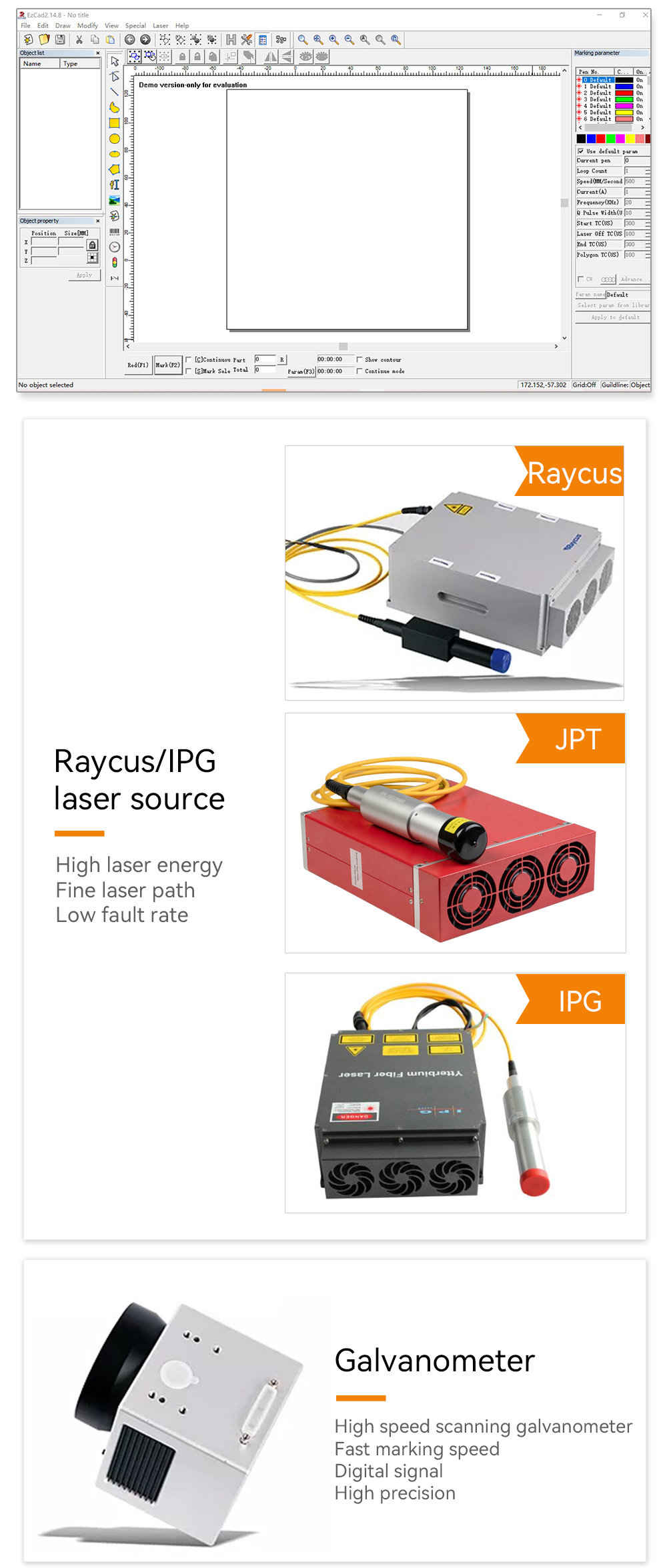 Laser source, Galvanometer, Lens, Mother board