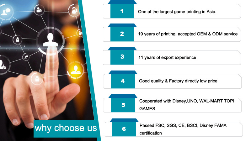 we are a factory specialized in poker, playing cards, education cards, board game, tarot card, jigsaw puzzle , custom packaging and other printing products. They are enjoys high reputation at home and abroad. we are mainly exported to North American, Europe and more than 30 countires. we are sincerely hope to your inquire.