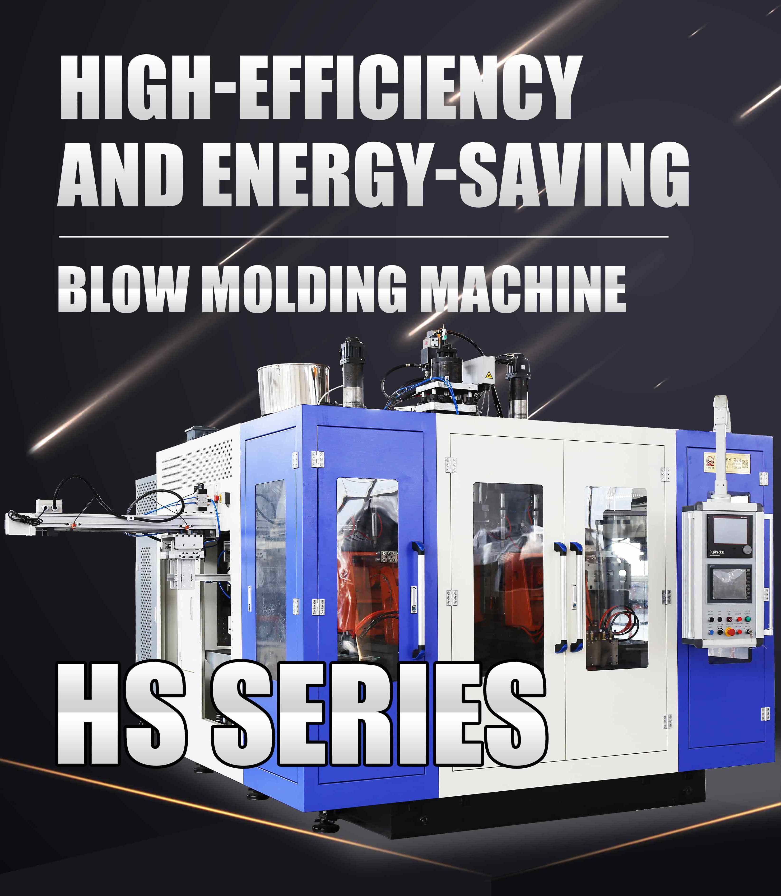 This is our best series machine. This is hydraulic servo system. The clamping unit is elbow style and the clamping force is more uniform. It is high speed and energy-saving. This machine is suitable for stacking product, jerry can, etc. It can be also equipped with several die-heads and then to make the small product.