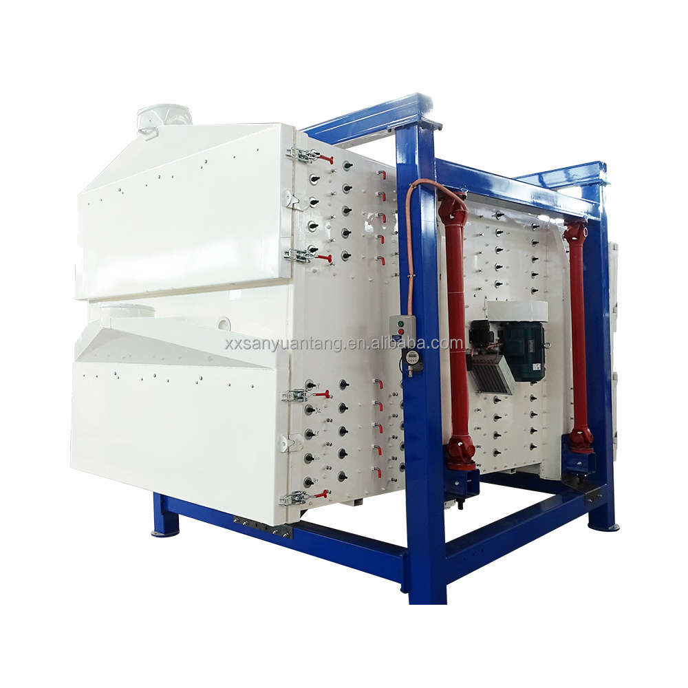Square gyratory screen, also known as square swing screen or square rotary screen, is a vibrating screen used to separate materials according to their particle size. It consists of a rectangular frame and a square mesh screen. Square rotating screens operate by a swivel motion produced by a fixed upper weight mounted on the frame and a rotating lower weight attached to the motor shaft. As the motor rotates, the weight creates a rotary motion, causing the material on the screen to follow a circular or elliptical path. This movement helps to evenly distribute the material on the screen and enables efficient screening of particles.