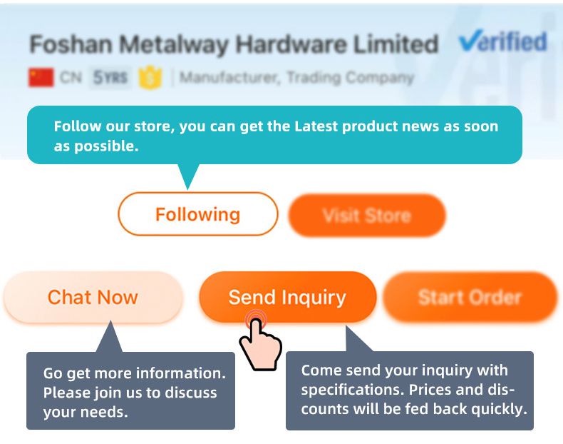 Metalway Hardware Manufacturer is a modern scientific and trading enterprise which integrating design, production and sales. Metalway specialized in shower hinge, glass door pull handle, fixing clamp, sliding door wheels, furniture legs, advertising screw, handrail and hardware fitting.