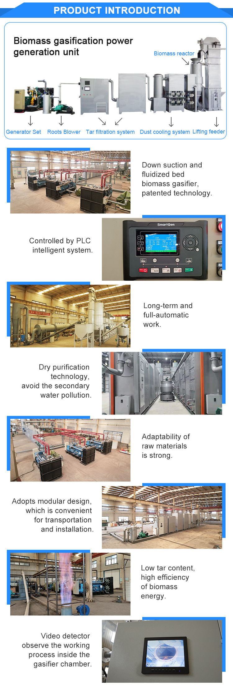 Biomass gasification power generation equipment mainly consists of biomass pyrolysis gasifier and syngas power generation equipment, supplemented by shredding equipment and drum drying equipment. The whole set of equipment adopts modular design, which is convenient for transportation and installation; the biomass gasifier adopts downdraft, fluidized bed and dry purification technology, so that biomass can be fully pyrolyzed, and secondary water pollution to the natural environment can be avoided; PLC automatic control system is used to realize automatic operation of the equipment, which does not need a lot of manual operation, and saves labor; the synthesis gas generator group control The control module adopts the control technology of generator set with microprocessor as the core, which has many functions such as automatic data recording, automatic operation, automatic control, automatic protection, etc., and has good reliability and stability. The operation parameters of the unit are displayed by large screen liquid crystal, which shows large and accurate data. The project covers a small area and does not need to expropriate too much land resources.