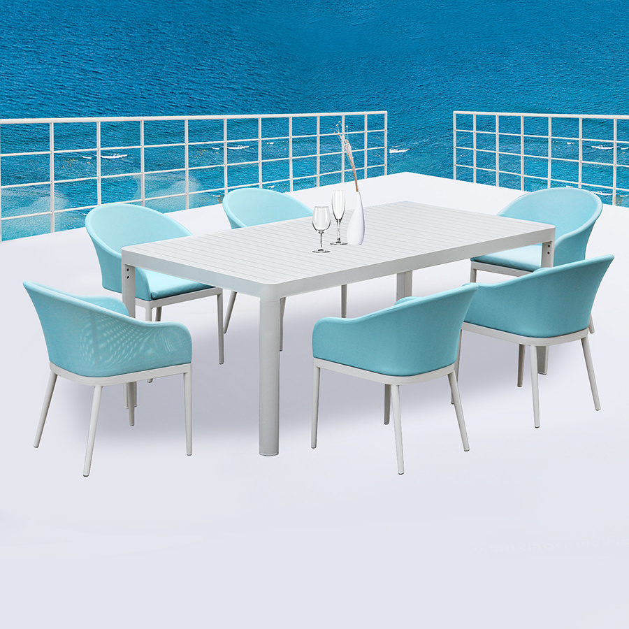 Residential & Commercial Outdoor Dining Set Aluminum Slat Top Table with 6 Olifen Woven Fabric Chair