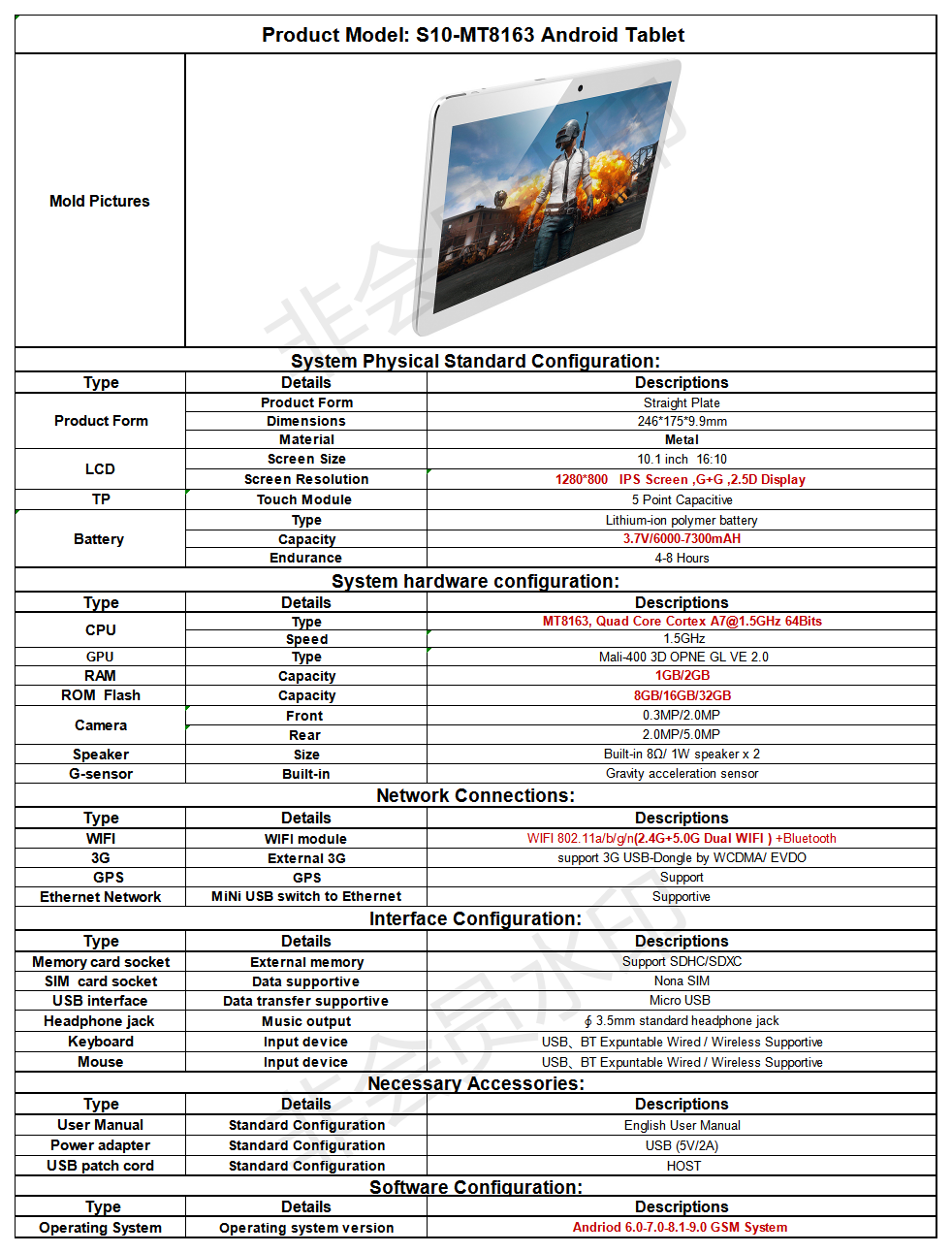 Product Model: S10-MT8163 Android Tablet