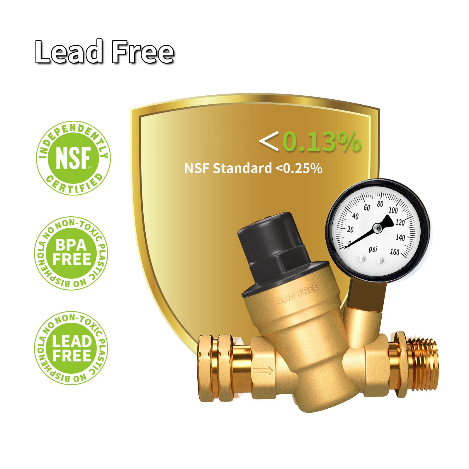 Class C46500 lead-free brass treated by hot casting process technology. Each regulator is tested to contain less than 0.13% lead, well under the NSF lead-free requirements of 0.25%, giving you a safe and healthy life.