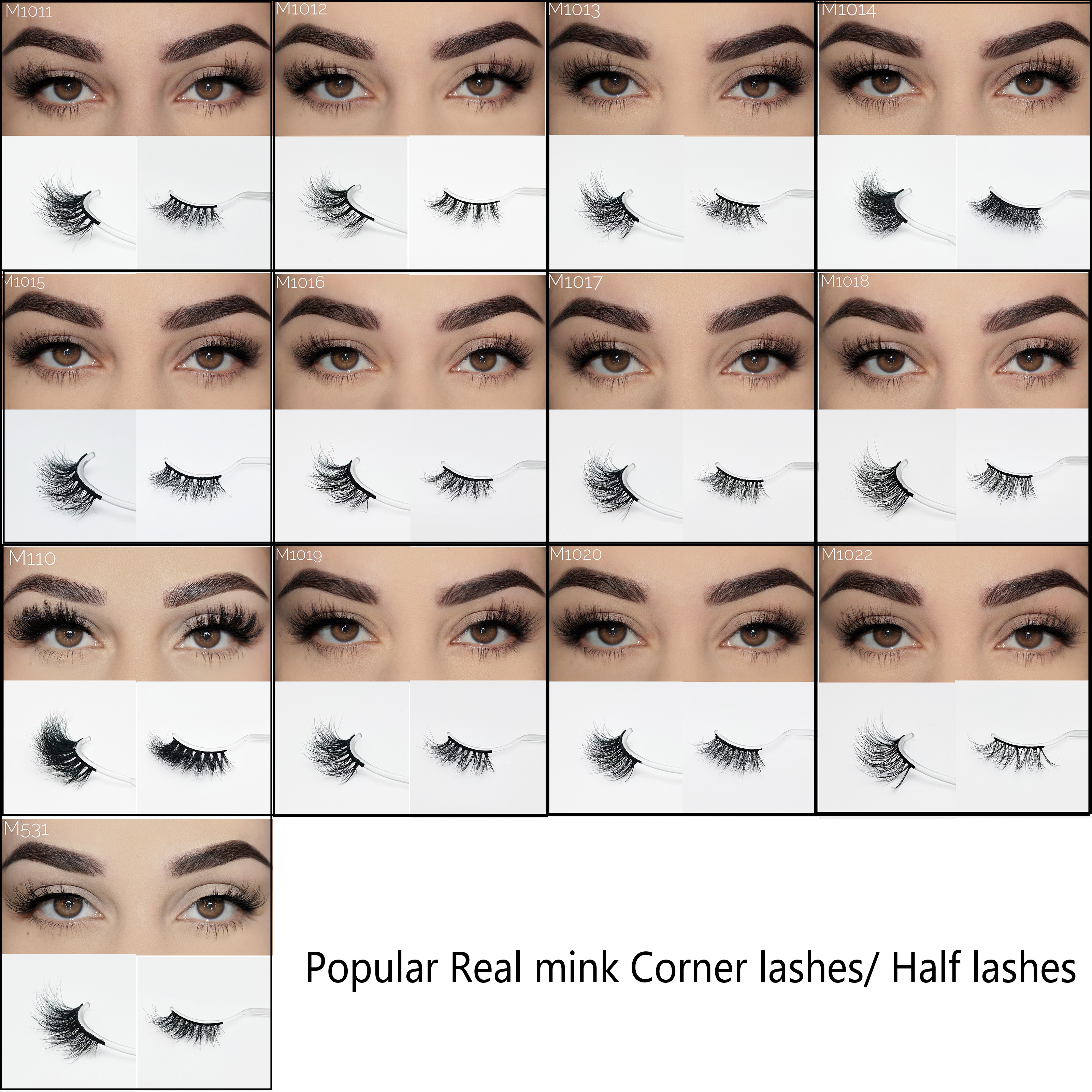 We have faux mink eyelashes, Normal mink fur lashes, natural eyelashes mink 3D, natural eyelashes mink 5D,25mm mink lashes,22mm mink eyelashes, 3D silk eyelashes, horse hair strip eyelashes and human hair eyelashes.Eyelash applicator