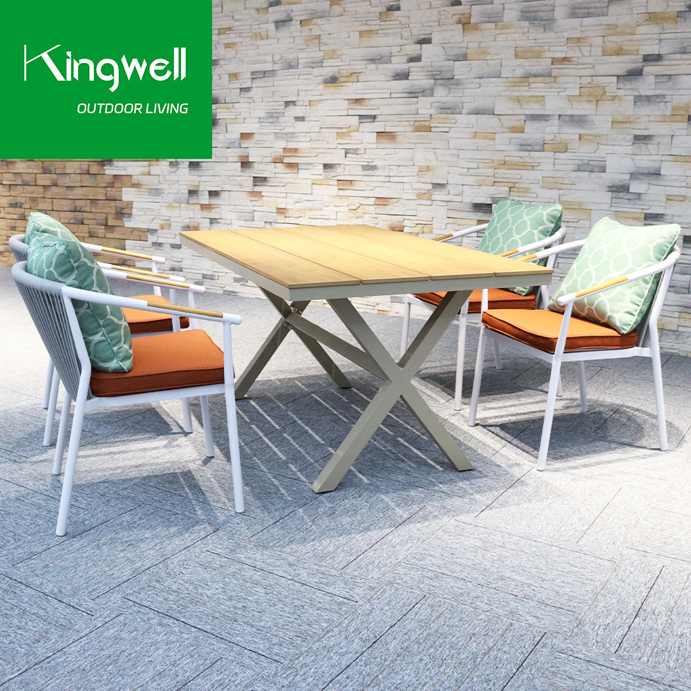 Hotel patio balcony furniture sets for restaurant luxury aluminum rope woven outdoor garden dining metal table and chairs set