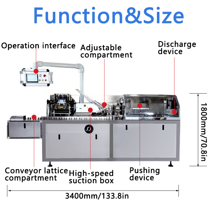 1. Automatic opening, folding instructions, blanking, feeding, batch number printing, box sealing, inspection and waste removal are adopted, with stable operation, low noise and simple operation adjustment.