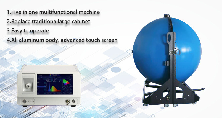 The test system can determine spectral power distribution, chromaticity coordinates, correlated color temperature, color rending index (Ra), color difference, peak wavelength, spectral half width, dominant wavelength, color purity, luminous flux, test for photometry colorimetry electricity of LED characteristics.