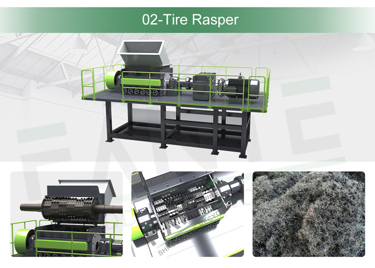 FTRR rasper is used as secondary tire recycling machine for primary size reduction of pre-shredded chips, it allows it to separate the wire from rubber tires in the purest, cleanest form possible, allowing processors to generate revenue streams from both rubber and wire..