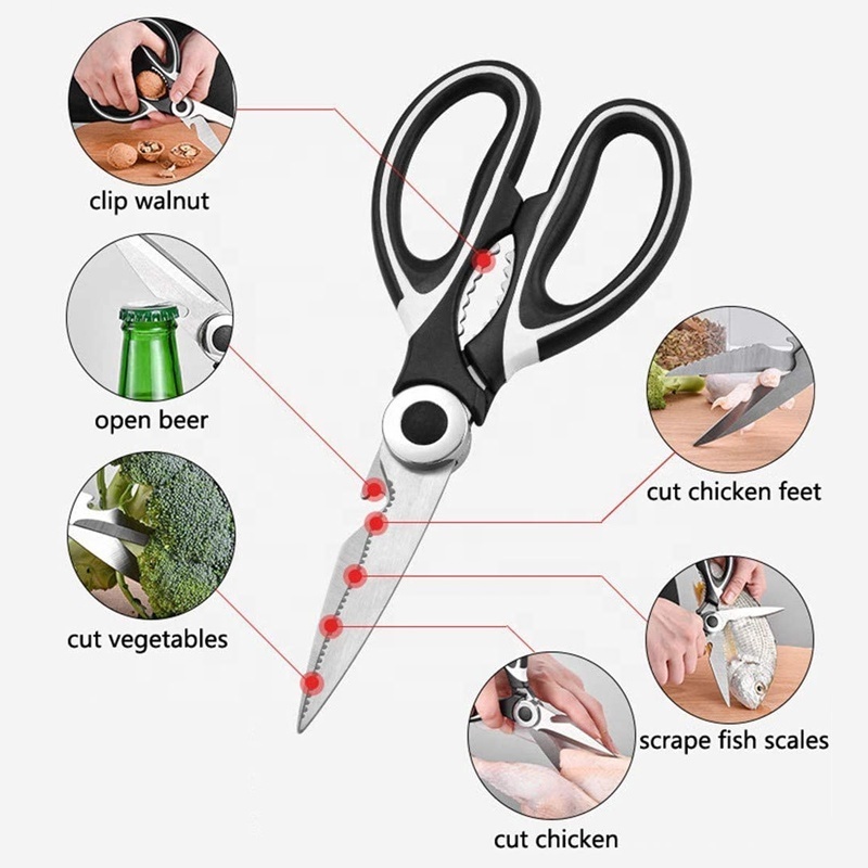 【Multi-Function KITCHEN SCISSORS】Multi-purpose scissors excellent for cutting large meats, bones, ribs, chicken wings, poultry, seafood, herbs, vegetables, and more. The innovative serrated blade design allows you to remove fish scales as well. Additional steel teeth located between the handles can open tightly sealed bottles, crack crab shells or nuts, and even works as a bottle pener. More versatile than a knife and as vital as a refrigerator to any kitchen!