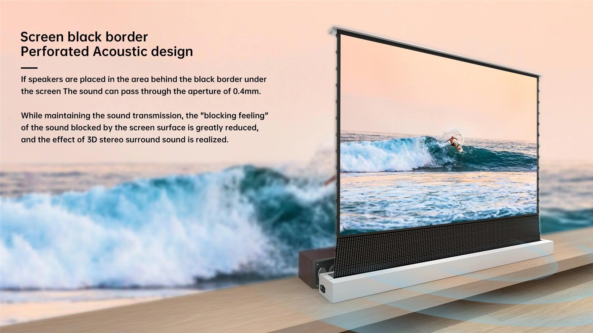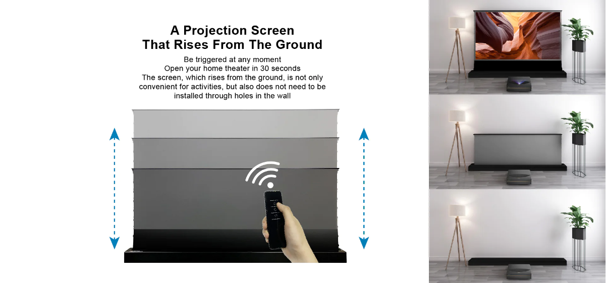 16:9 HDTV format Motorized ambient light rejecting ALR electric floor ascending projector screen with remote control is a premium,retractable & installed beneath the floor for a seamless look that extend upwardan excellent solution for any multi-use home theater, house of worship, sports bar, conference room, etc.