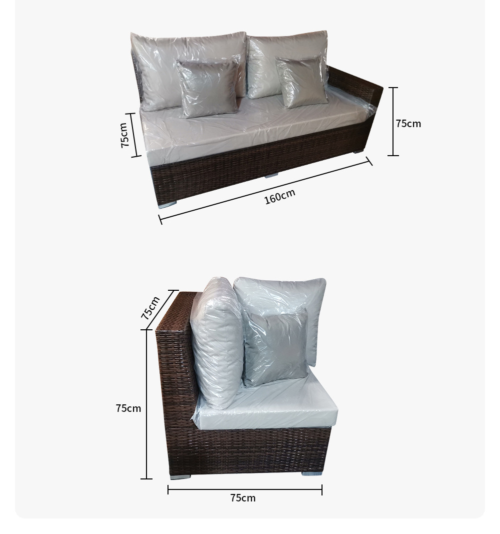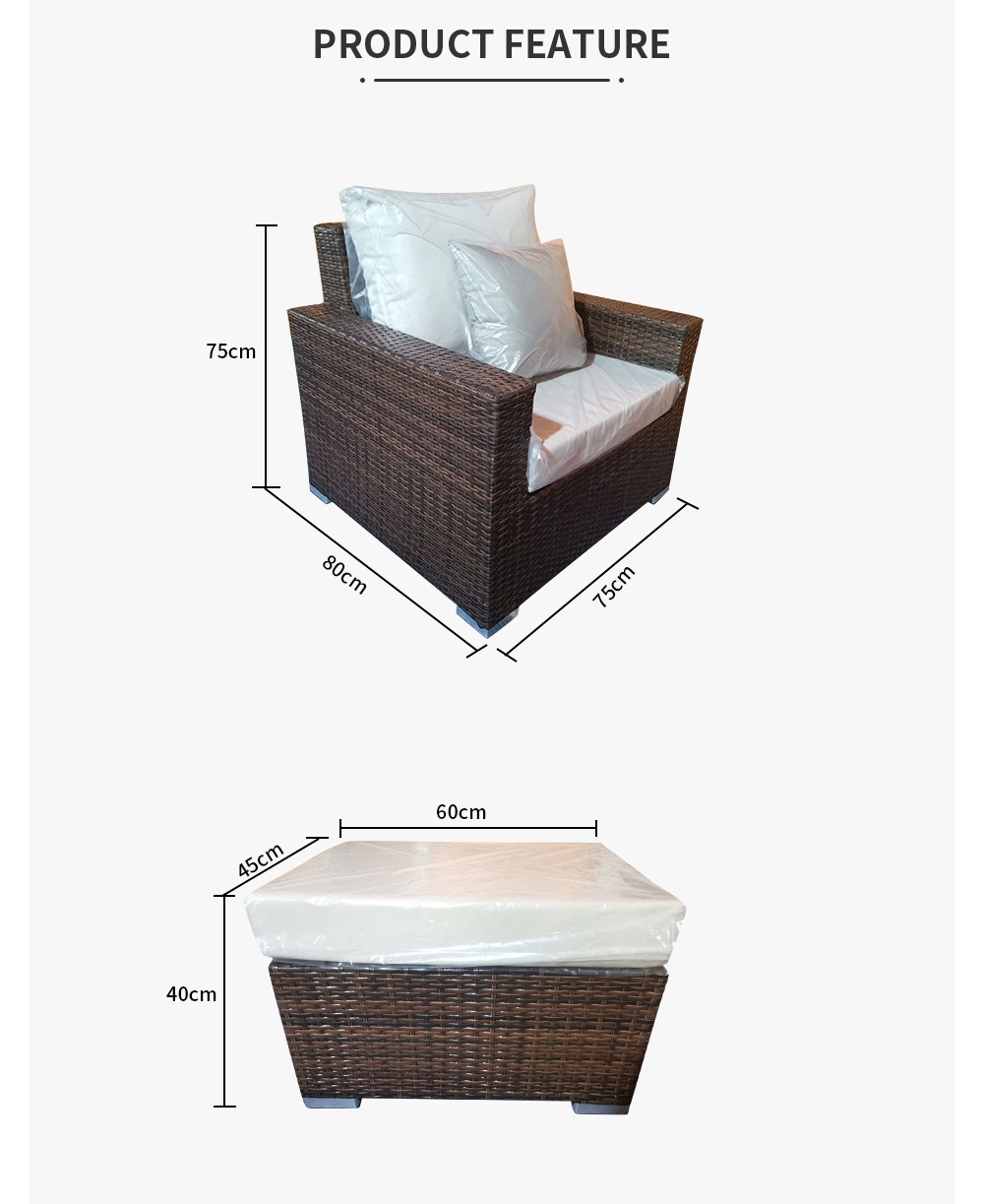 Single sofa: 80*75*75cm Double seater W/A: 160*75*75cm Corner sofa: 75*75*75cm Coffee table: 80*60*40cm Side table: 45*45*50cm Ottoman: 60*45*40cm