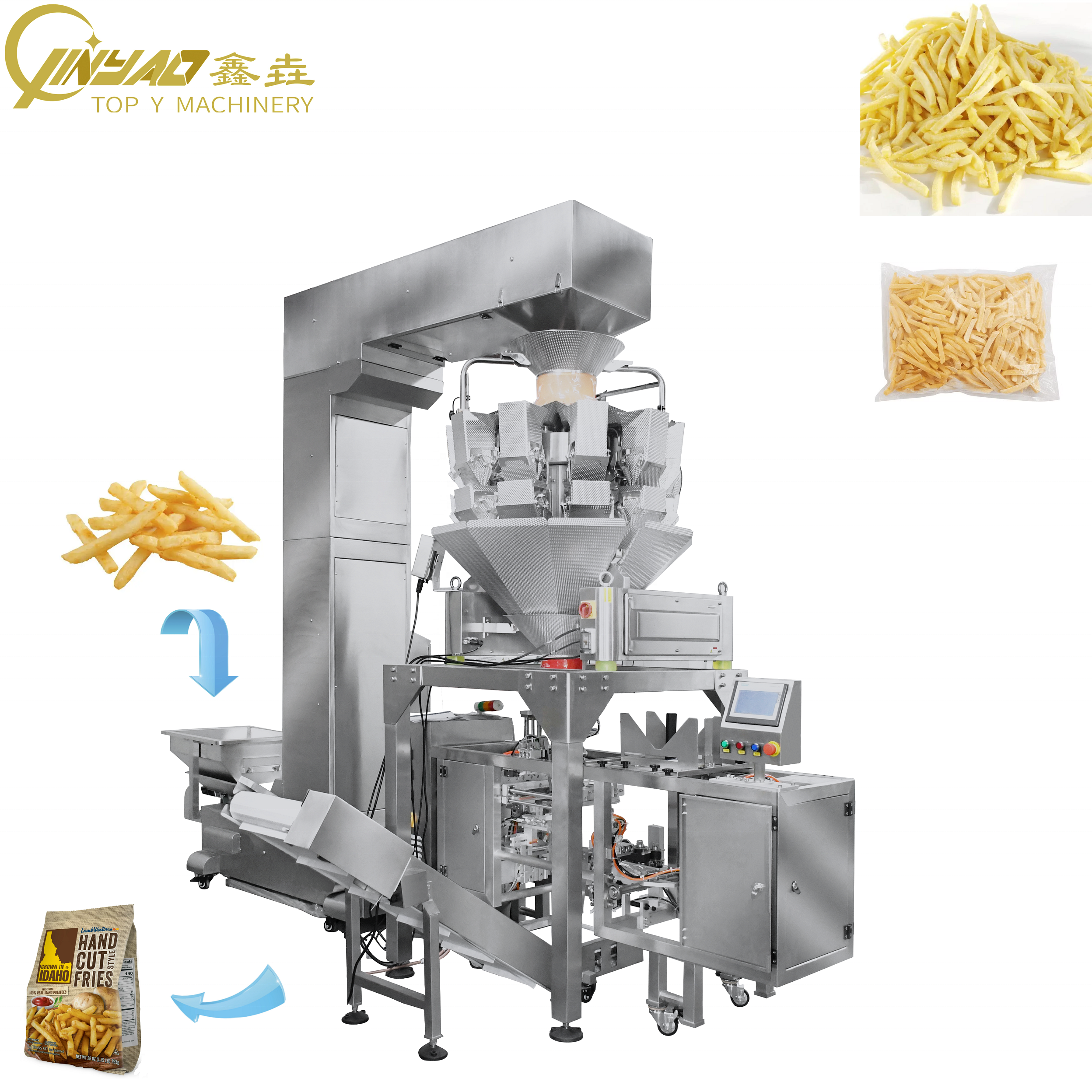 Besides, by connecting with different weighing equipments, the packing system can handle various products, such as powder, snacks, dried vegetable or fruit, puffed food, liquid sauce, beverage, etc