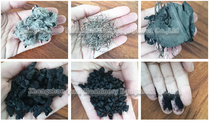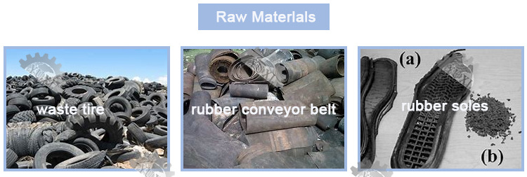 Raw materials: waste tires, rubber soles, waste pipes, rubber conveyor belts and other waste rubber products, of which waste tires are the most.
