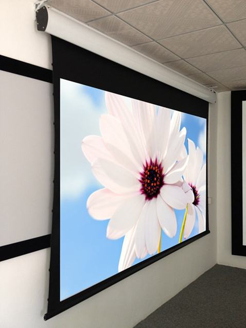 ability to be wall mounted or ceiling hanged. The floating L-bracket design allows for horizontal adjustment and therefore the brackets can be fixed at any preferred point on the screen casing. Tightening screens ensure the screen remains locked and secure.