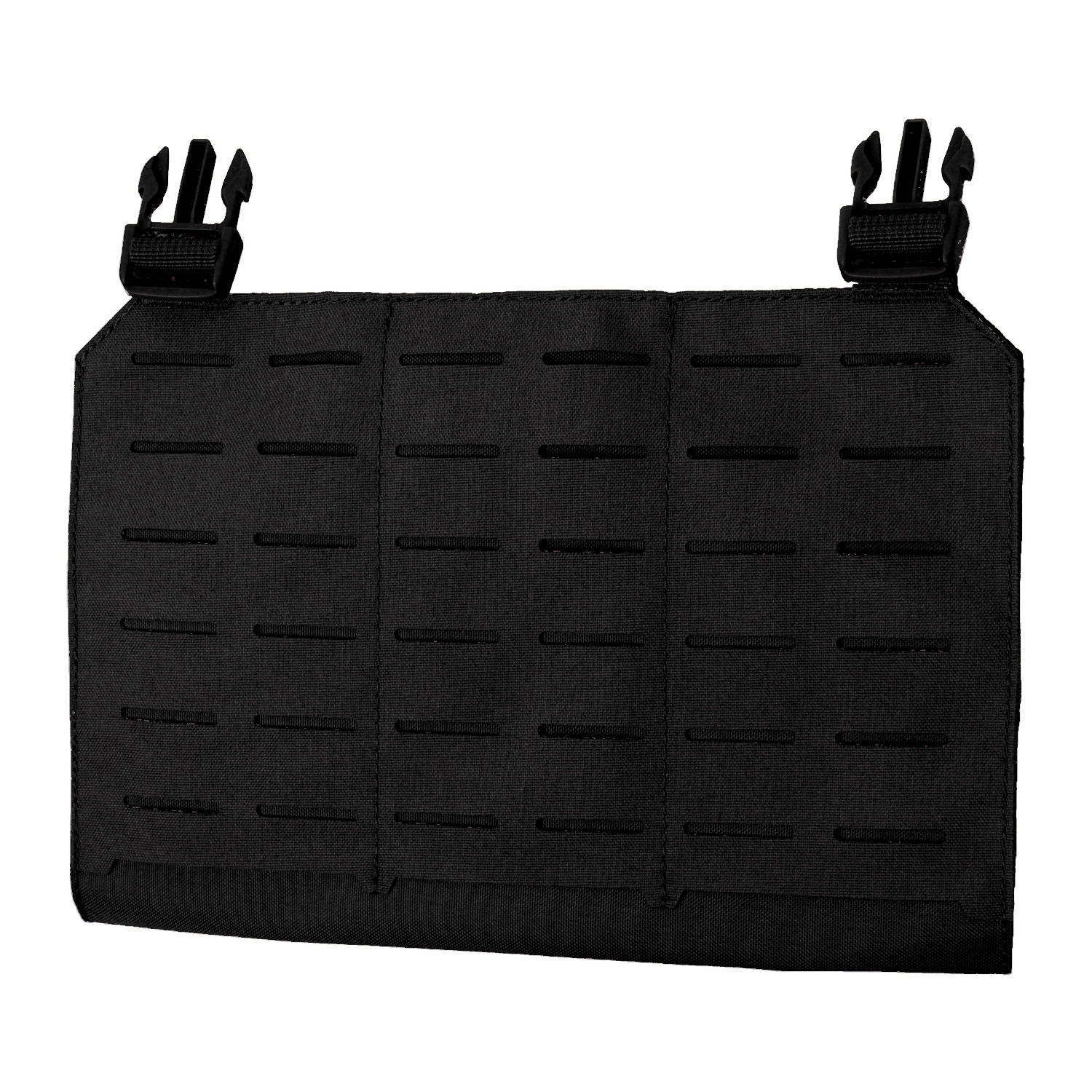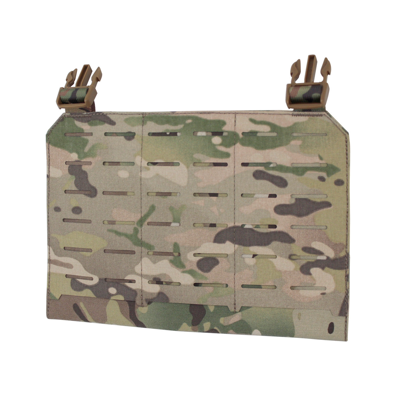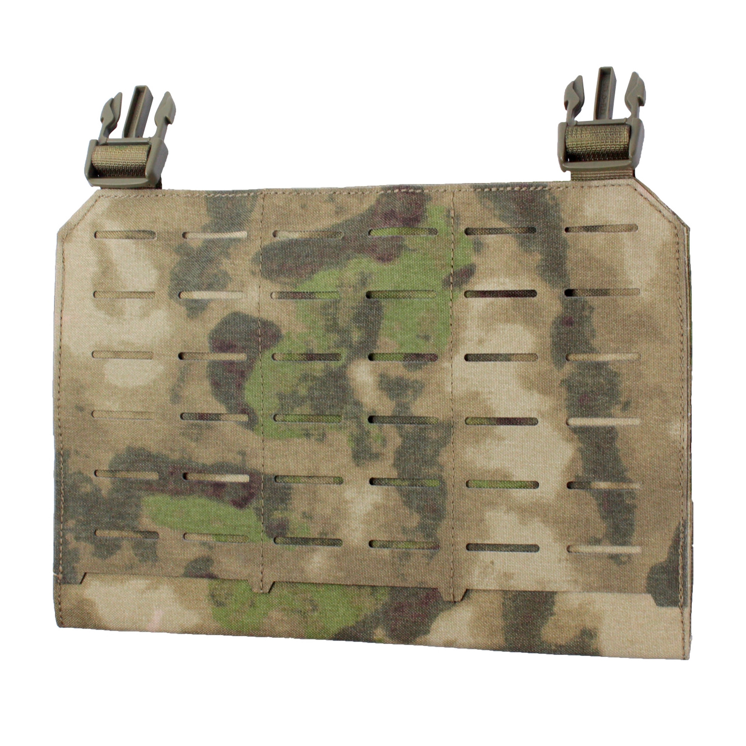 This modular panel can be attached to any plate carriers that features female buckle (about 18cm between two buckles). The back of the panel has hoop and loop area for better attachment with the plate carrier. Panel size:26.5x18.5x1cm Weight:about 120g 36 laser cut molle points The strap of male buckle is adjustable:0 - 6 cm